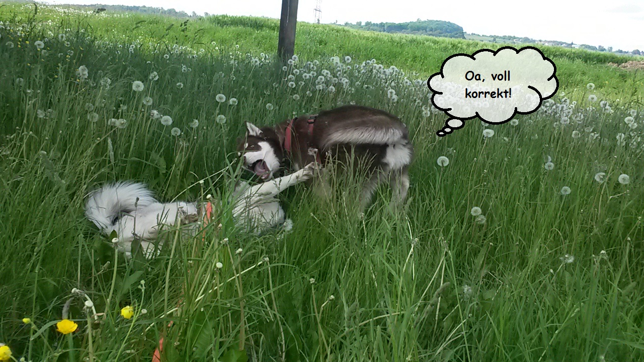 In der Hundeschule wird manchmal eine Übung gemacht, bei der die Menschen die Unterhaltungen ihrer Hunde synchronisieren müssen. Natürlich geht das mit unserer Judith viel ernster ab und orientiert sich am Interaktionsverhalten der Hunde in einer bestimmten Situation, aber das Herrchen und das Frauchen synchronisieren jetzt standardmäßig ihre Hunde.*