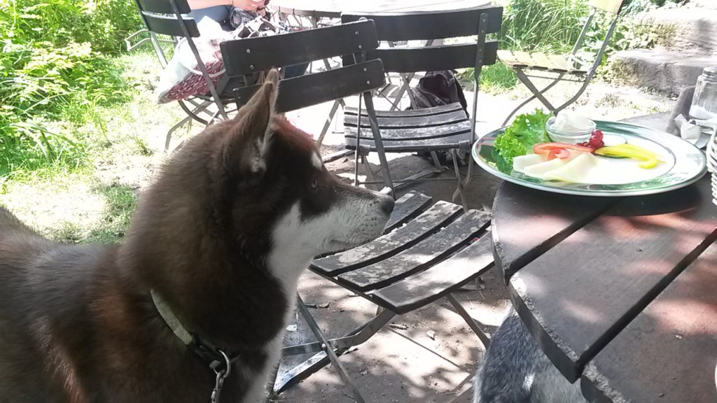 Nun, heute hat das Frauchen mal ein bisschen was für die Nachwelt festgehalten. Es gibt, so die Technik will, zwei Videos und eine Bildergalerie von der wohlverdienten Belohnung nach der harten Arbeit im Ufercafé. Das erste Video ist vom Klick-für-Blick Üben aus dem AJT Programm, das die Menschen dem Bubs aufdrücken, weil es beim Althund so gut geklappt hat.2 Der Rülpe hat das Spiel schon längst durchschaut und versucht, das Frauchen zum Leckerchenspender umzufunktionieren, weswegen nicht mehr jeder Blick belohnt wird. Weitere Bausteine des Programms wie der Superschlachtruf, „raus da“, „weiter“ und allerlei Impulskontrolle und Aufmerksamkeitslenkung wurden bereits seit Monaten aufgebaut. Das klappt alles je nach Hormonlage sehr gut oder mäßig. Mäßig heißt in dem Fall, dass man den Rülpen wegscheuchen oder zu einem Spiel animieren muss. Pathologischer Jagdwahn, wie man ihn beim Althund früher gewohnt war, trat bisher – toitoitoi – noch nicht auf. Der Superschlachtruf ist zudem nützlich, um den Rülpen von verwesten Snacks wegzulocken. Einige Jäger im Revier sind unglaubliche Ferkel und lassen ihre Reste direkt am Wegrand gammeln…
