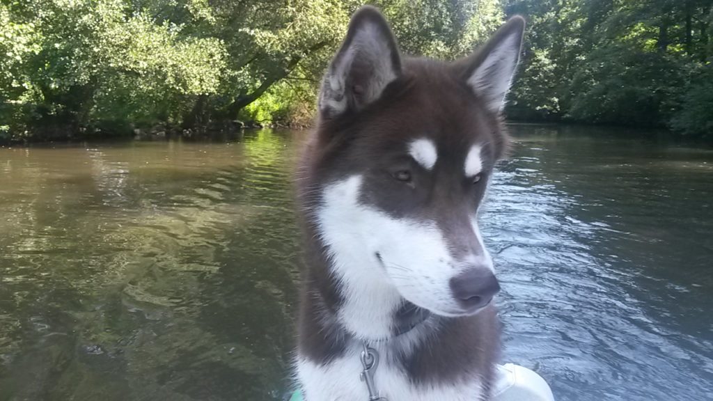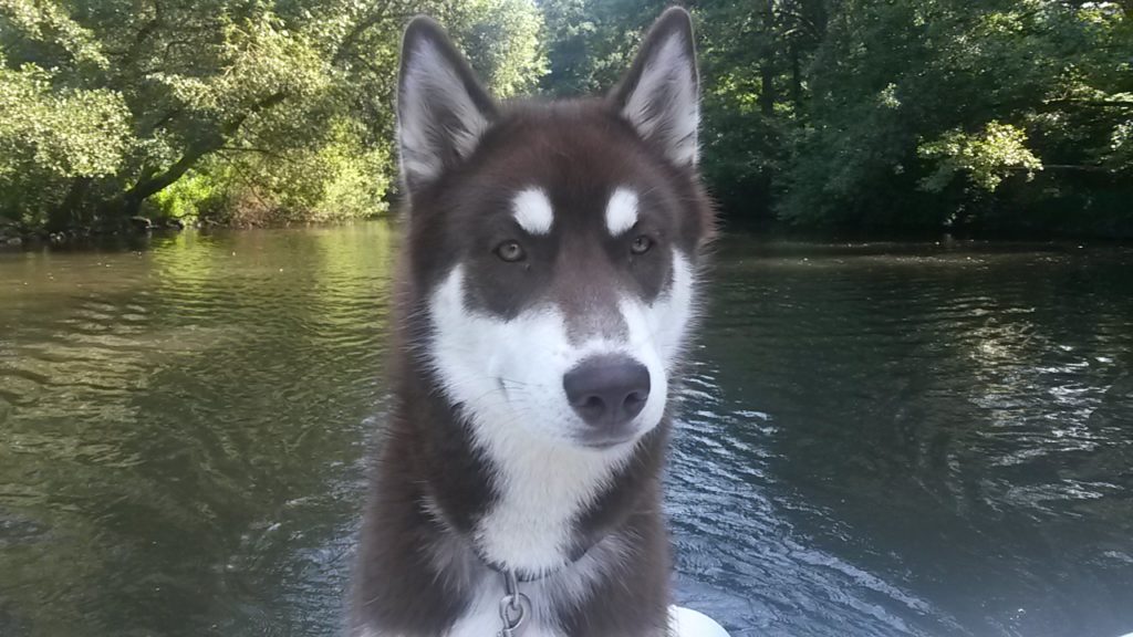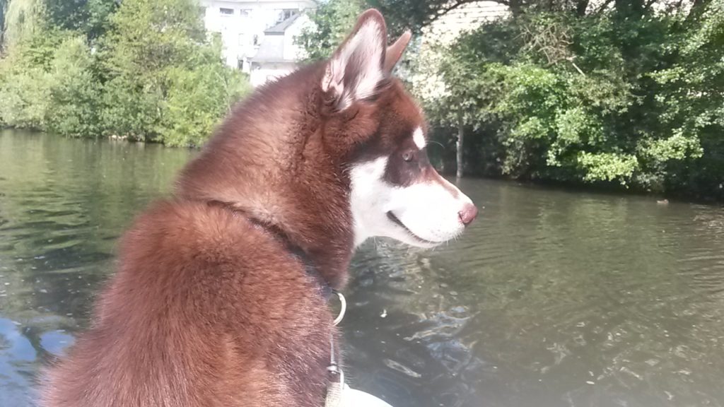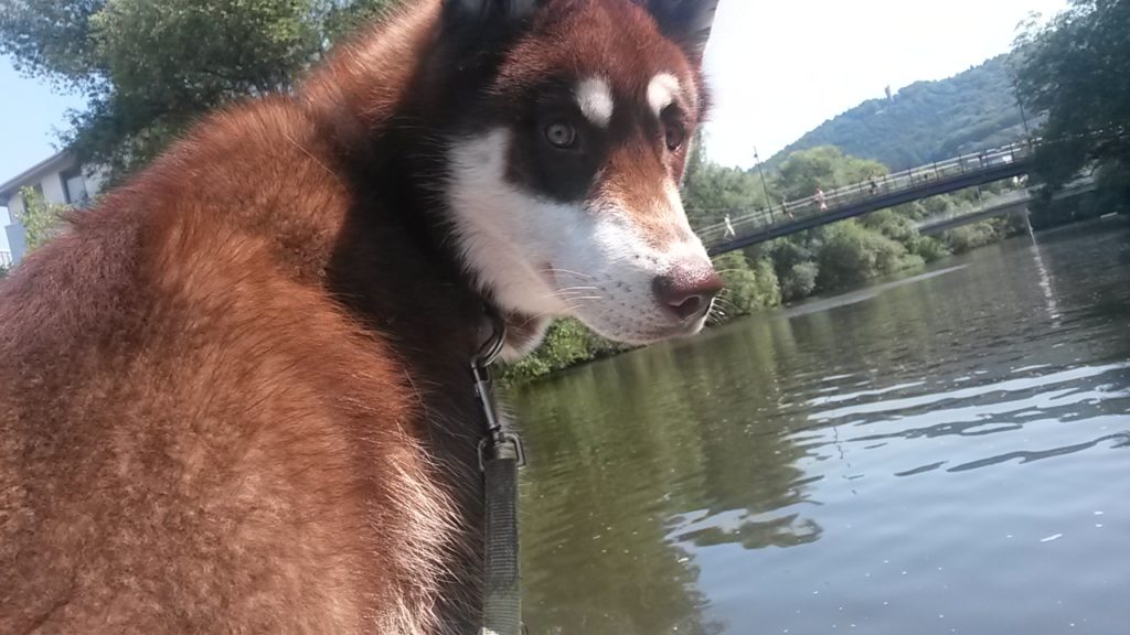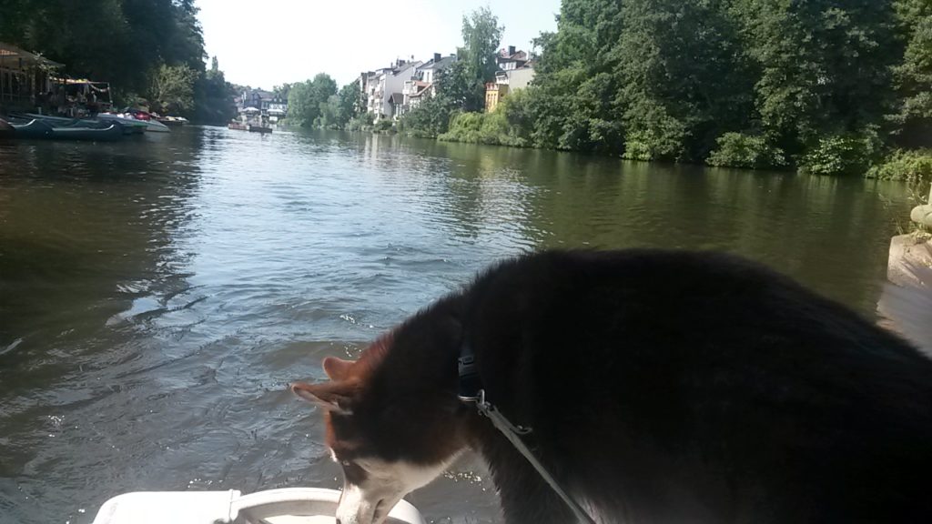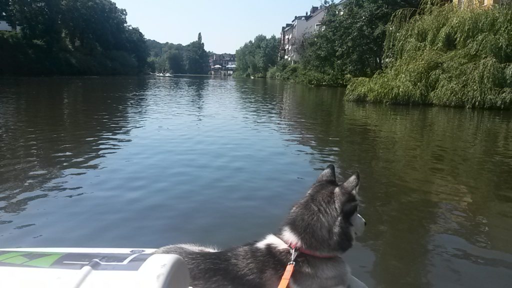 Für den schönen Sommertag heute war ein lang geplanter Ausflug in den Kalender eingetragen: Tretbootfahren auf der Lahn. Die mutigsten Hunde, die je im Rudel gewohnt haben, sprangen ohne zu zögern auf das gemietete Tretboot und ließen sich hochherrschaftlich über den trägen Fluss schippern. Sorgen im Vorfeld, ob das schnöde Hundefutter Anreiz genug wäre, um sie auf das wackelige Bootchen zu locken, stellten sich als unbegründet heraus. Dieses Mal musste auch kein Hund gegen seine Würde getragen werden. Huskies scheinen seetüchtiger als Malamute oder Mischlinge zu sein. Das heißt natürlich nicht, dass der Rülpe nicht direkt nach dem Übersetzen auf das Boot die Leckerchentasche geplündert hätte. Wenn das Frauchen die auch offen lässt und sich um das Seil am Bootssteg kümmert…