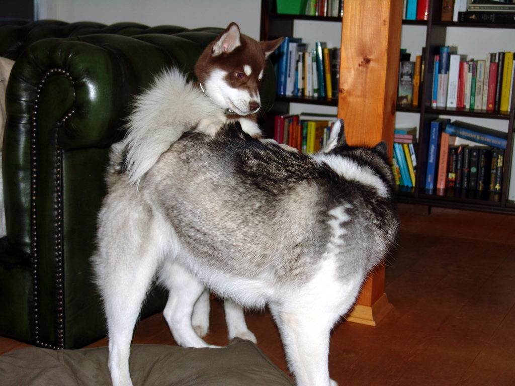 Ja, die Stelle, an der der Welpe dem Althund immer in die Rute beißt, ist schon oxidierter-Speichel-rot. Aber das macht dem Althund nichts, der Althund ist rundum glücklich mit seinem Welpen.