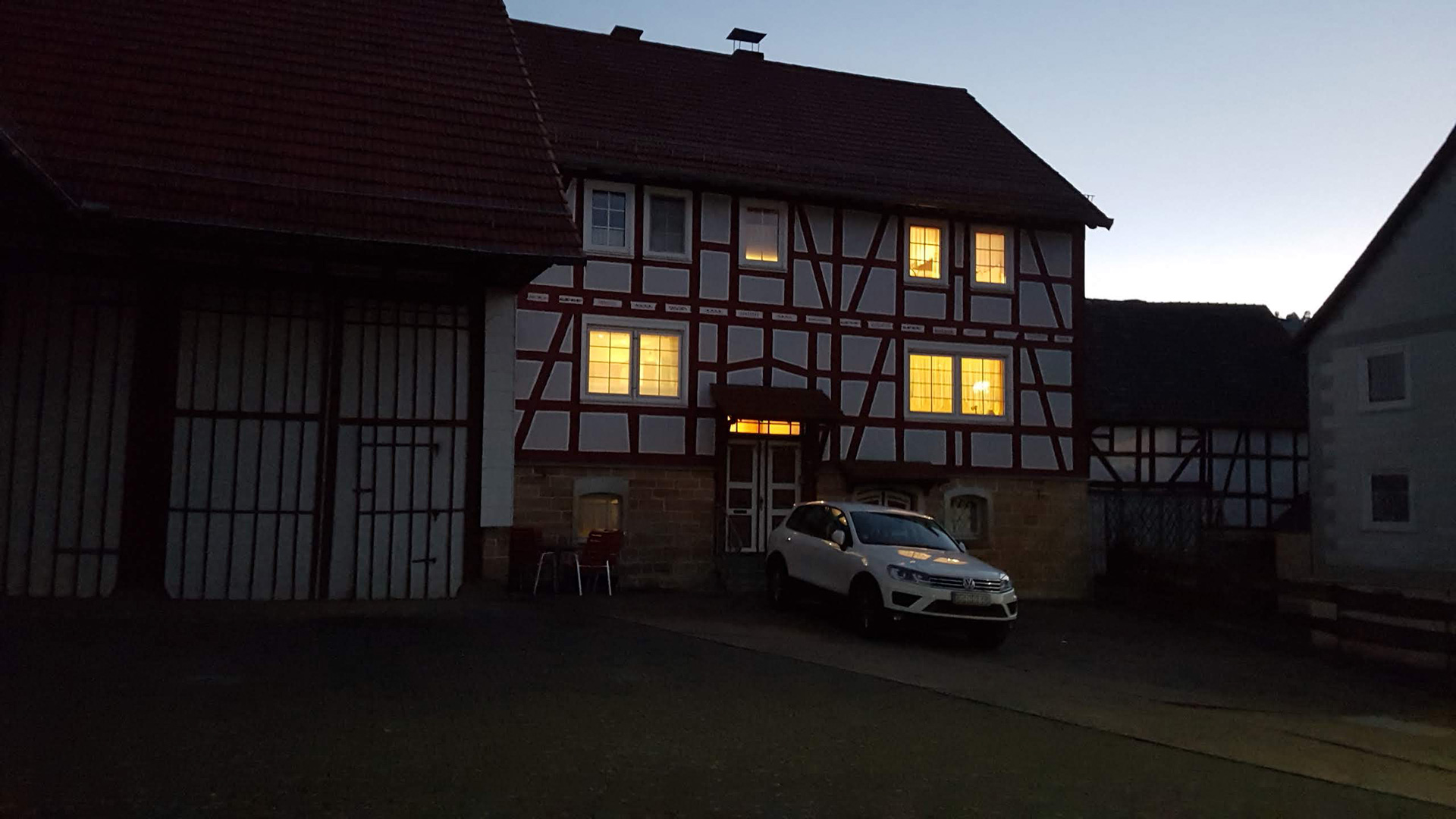 Als vor etlichen Jahrzehnten der Nachbarhof übernommen wurde, trug man dessen Wohnhaus bis auf das Sandsteingeschoss ab und integrierte den Bau in den Neubau der Scheune. Der Hof war zu dieser Zeit eines der größten Anwesen im Dorf und  wurde bis Anfang des 21. Jhs. als Bauernhof betrieben, zuletzt als Milchwirtschaft mit knapp dreißig Kühen. Davon ist – neben der großen Scheune und dem zu Garagen umfunktionierten Nebengebäude – noch der Ende der 1950er Jahre gebaute Stall erhalten. Hinter den Gebäuden befindet sich ein ausgedehntes Grundstück, teilweise mit altem Obstbaumbestand, durch das ein Bach fließt. Das Grundstück grenzt hinten an Wiesen und alte Gärten, wir haben also direkten Zugang in die Natur.