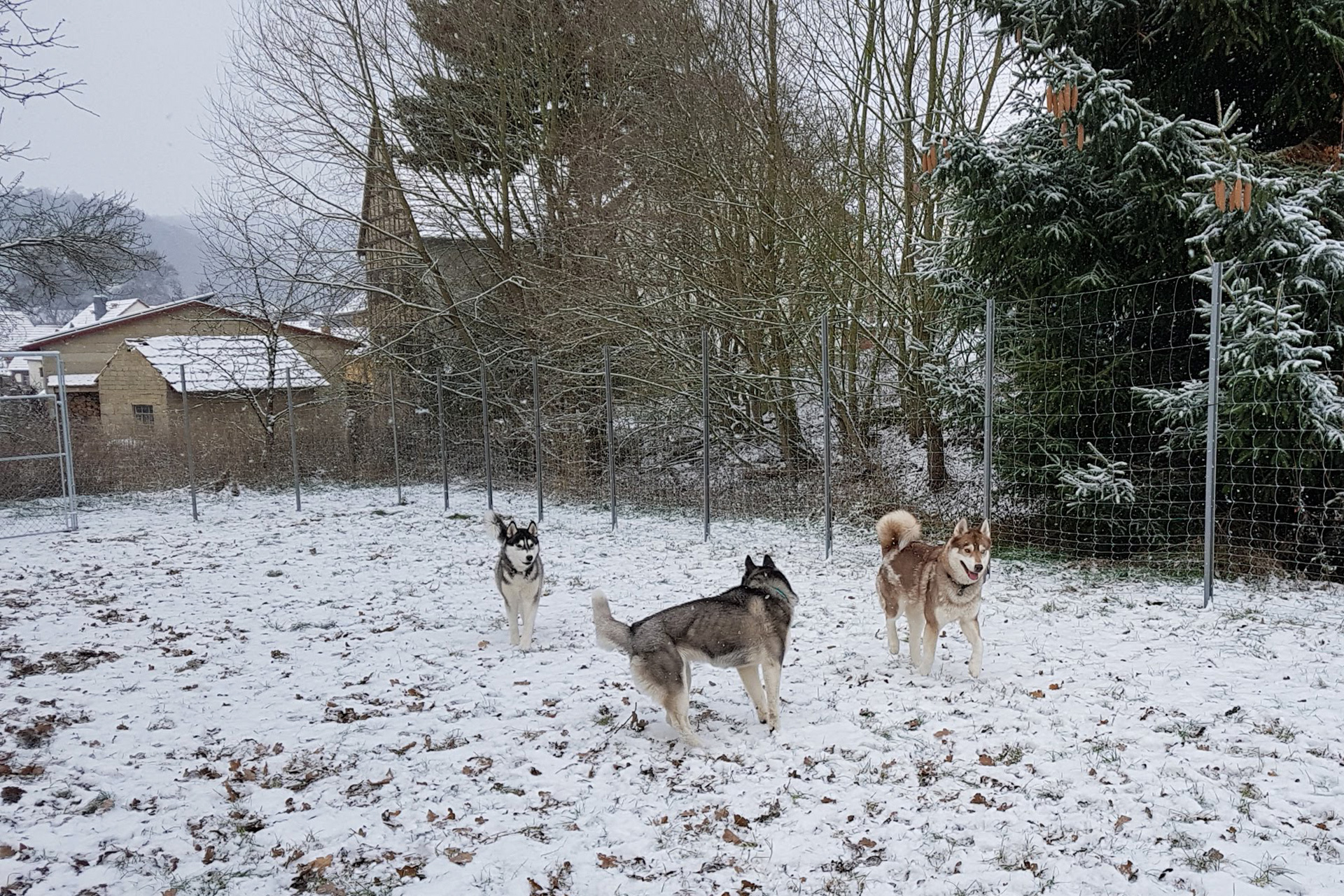 Unsere Hunde wohnen mit uns in Haus und Garten, außerdem nutzen wir den Auslauf und die Wege in der Umgebung für Spaziergänge, Wandern und Zugsport. Unsere Welpen werden in einem Wurfzimmer im Obergeschoss geboren, gleich neben unserem Wohnbereich, und ziehen von dort aus, sobald ihre Entwicklung es zulässt in eines der Wurfzimmer im Erdgeschoss und verbringen so viel Zeit wie möglich im Welpenauslauf im Garten. Aus der früheren Milchküche im Untergeschoss wurde unsere Futterküche und das allererste Badezimmer haben wir zum „Hundespa“ umfunktioniert.