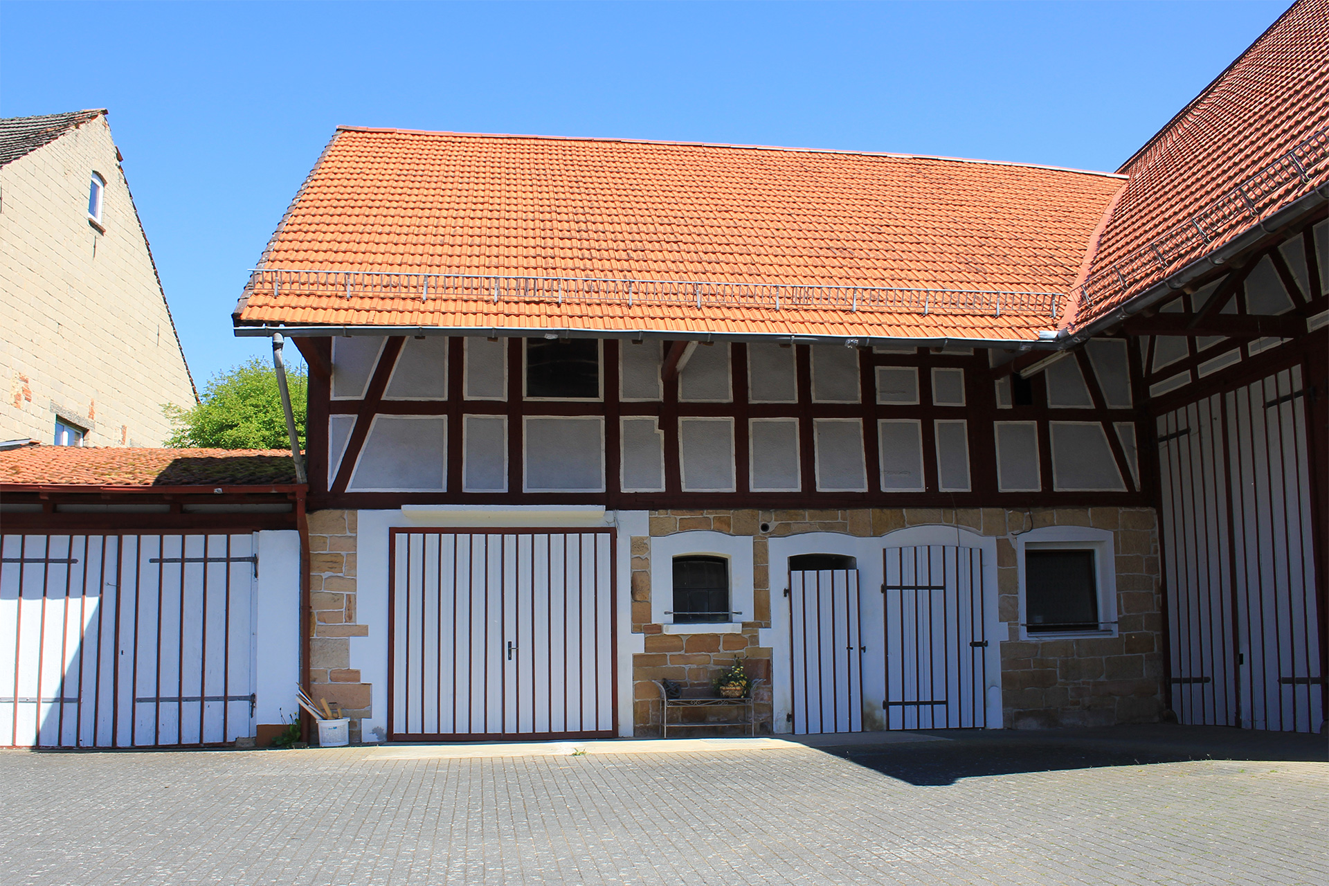 Als vor etlichen Jahrzehnten der Nachbarhof übernommen wurde, trug man dessen Wohnhaus bis auf das Sandsteingeschoss ab und integrierte den Bau in den Neubau der Scheune. Der Hof war zu dieser Zeit eines der größten Anwesen im Dorf und  wurde bis Anfang des 21. Jhs. als Bauernhof betrieben, zuletzt als Milchwirtschaft mit knapp dreißig Kühen. Davon ist – neben der großen Scheune und dem zu Garagen umfunktionierten Nebengebäude – noch der Ende der 1950er Jahre gebaute Stall erhalten. Hinter den Gebäuden befindet sich ein ausgedehntes Grundstück, teilweise mit altem Obstbaumbestand, durch das ein Bach fließt. Das Grundstück grenzt hinten an Wiesen und alte Gärten, wir haben also direkten Zugang in die Natur.