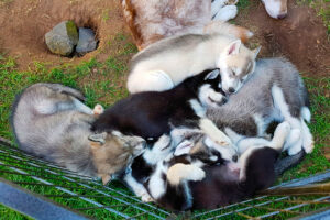 Nun warteten wir darauf, dass Ezri wieder läufig wurde. Denn die beste Huskymama aller Zeiten hat mit großer Freude nicht nur ihre eigenen Würfe aufgezogen, sondern auch ihre Tochter Ronja bei deren Kinderschar tatkräftig unterstützt.