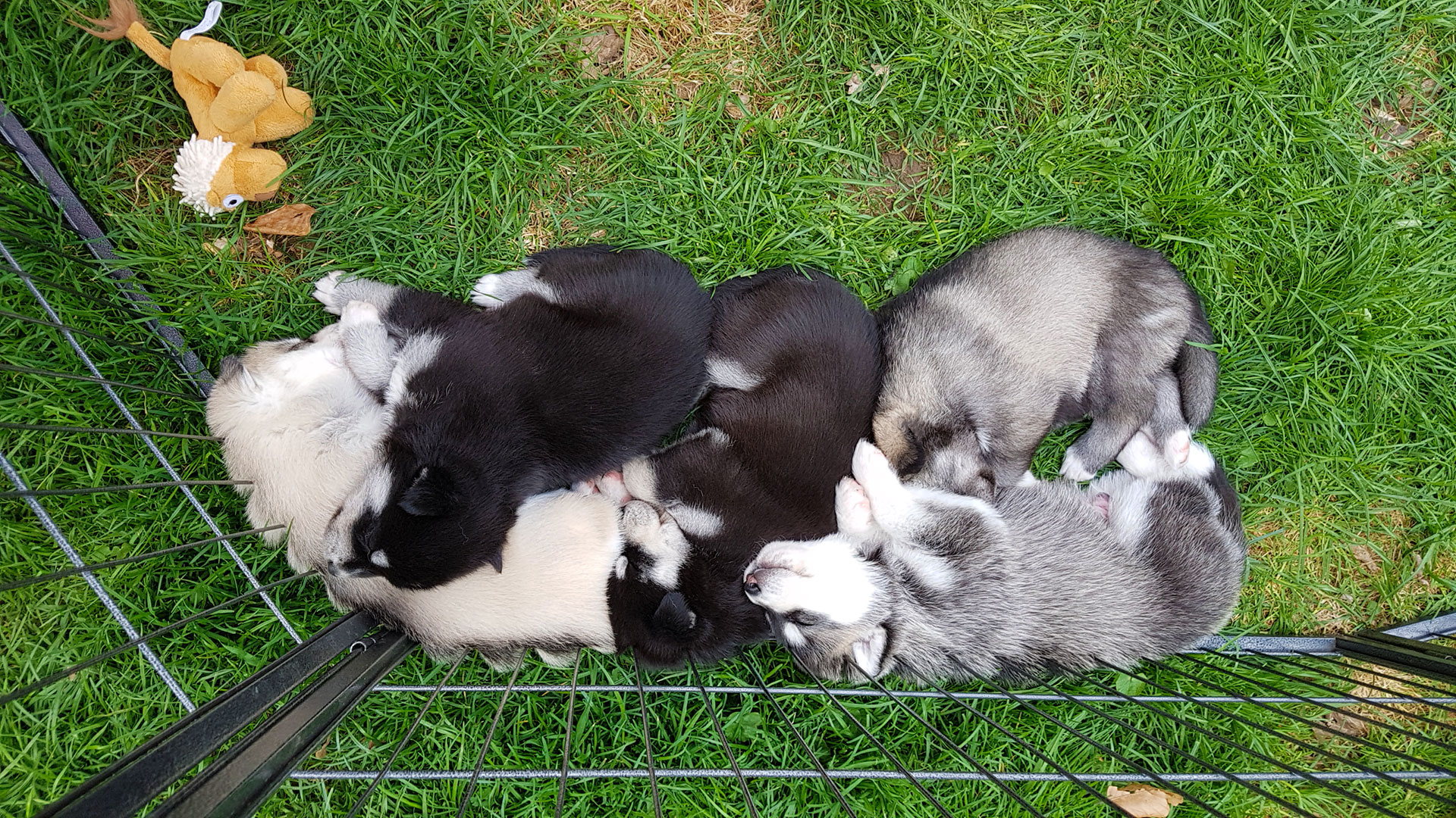 In den folgenden Wochen entwickelten die fünf Freunde sich prächtig, aber ihre Mama haben sie ganz schön geschunden. Seit der fünften Lebenswoche konnte sich die wilde Bande fast täglich im Gartengehege aufhalten. So hatten sie viel Platz zum Toben und Lernen – ganz besonders von Onkel Sisko und Mama, aber auch von Opra, die inzwischen zu uns gekommen war.