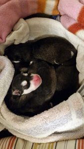 Am Nachmittag des 22. Dezember begann die Eröffnungsphase der Geburt, die sich über den ganzen folgenden Tag hinzog. Am Morgen des Heiligabends setzten stärkere Wehen ein. Der erste Welpe wurde kurz nach 13:30 geboren, drei Stunden später der zweite. Nach diesem hatte Ronja es eilig und ließ sich nur eine halbe Stunde Zeit. Dann lag sie mit ihren drei kleinen schwarz-weißen Buben in der Wurfkiste und erholte sich. Um 19:00 Uhr brachte sie ein schwarz-weißes Mädchen zur Welt.