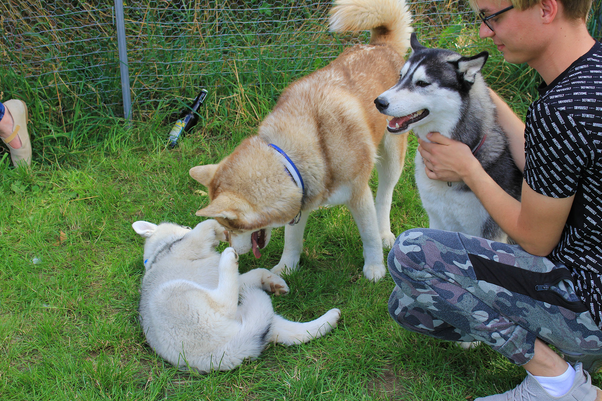 Ezri finally laid down in the middle of the lawn, lost in thought, smiling. Not until Nukka’s master started to play the dog whisperer, she joined the pack, sitting around the man with the magic pockets.