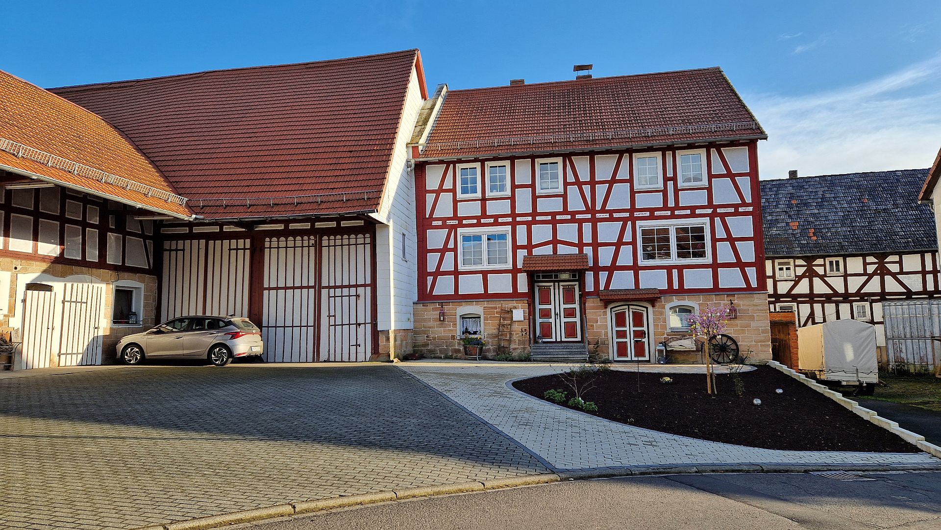 When the owners annexed the neighboring farmhouse, its farmstead was stripped from its timbered stories and integrated into the huge newly built barn. Those days, the farm was one of the biggest in this village and it still operated until the beginning of this century, most recently as a dairy farm, housing about 30 cows. Apart from the barn and the outhouse, the stables, built in the late 1950ies, is a relic of those times. Behind the buidlings there is a huge lawn with an old orchard and a little creek running through. The estate backs onto meadows and old gardens, so we live close to nature.