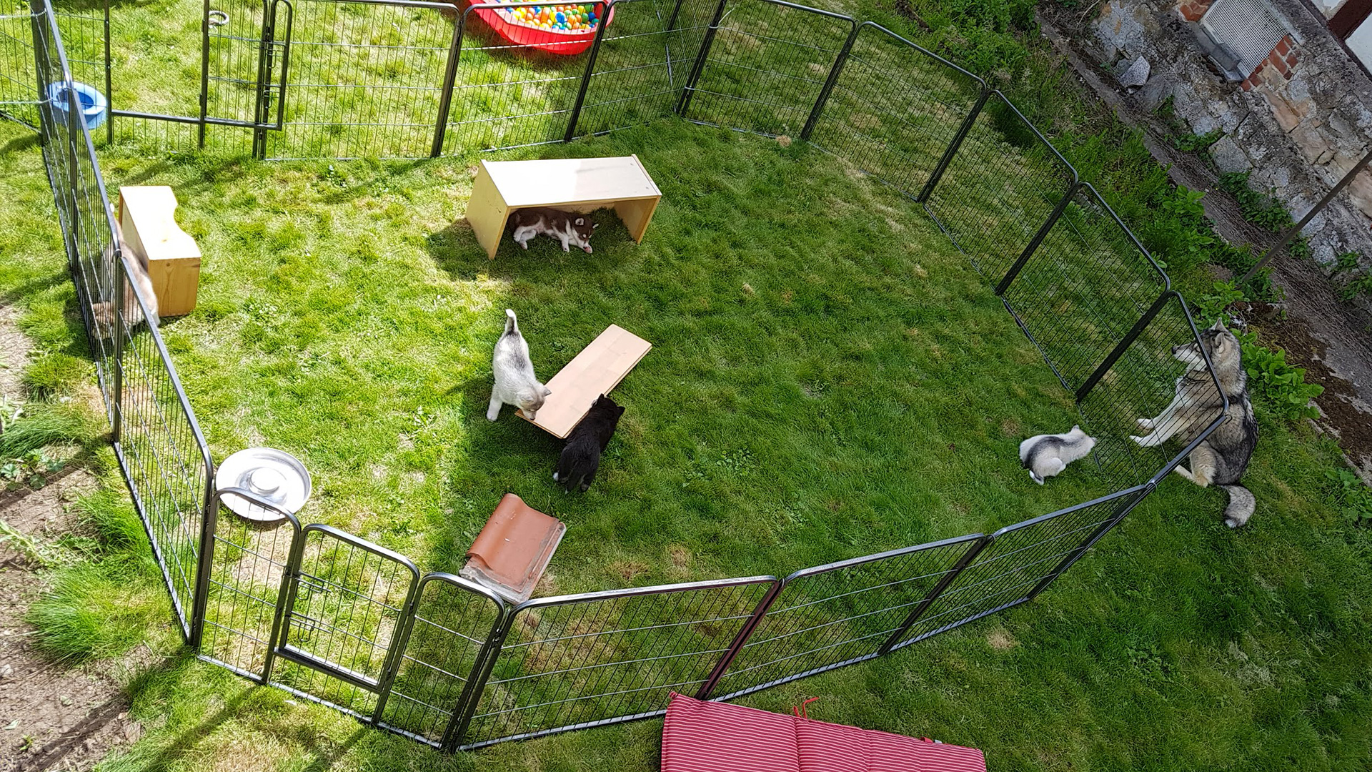 We keep the dogs in the house and the garden and additionally use the dog yard and the tracks and little roads for walkies, dog-trekking and mushing with bike and scooter. The pups are born in a whelping room upstairs. When they are old enough, they move into a puppy room in the ground floor and spend as much time as possible in a puppy pen in the garden. We use the former “dairy kitchen” for dogs’ food and supplements and grooming, and the very first bathroom was turned into a little “dog spa”.