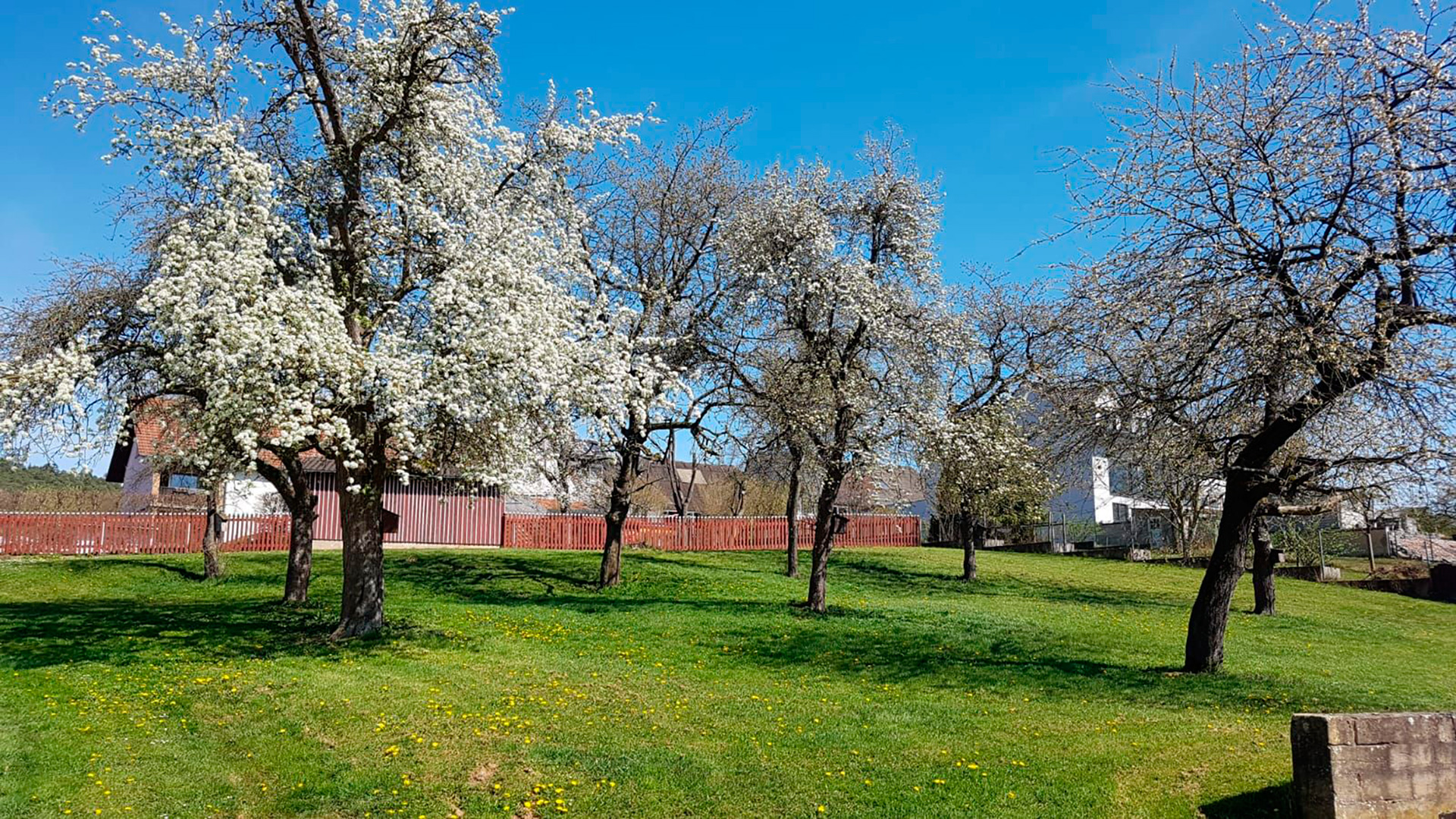 When the owners annexed the neighboring farmhouse, its farmstead was stripped from its timbered stories and integrated into the huge newly built barn. Those days, the farm was one of the biggest in this village and it still operated until the beginning of this century, most recently as a dairy farm, housing about 30 cows. Apart from the barn and the outhouse, the stables, built in the late 1950ies, is a relic of those times. Behind the buidlings there is a huge lawn with an old orchard and a little creek running through. The estate backs onto meadows and old gardens, so we live close to nature.