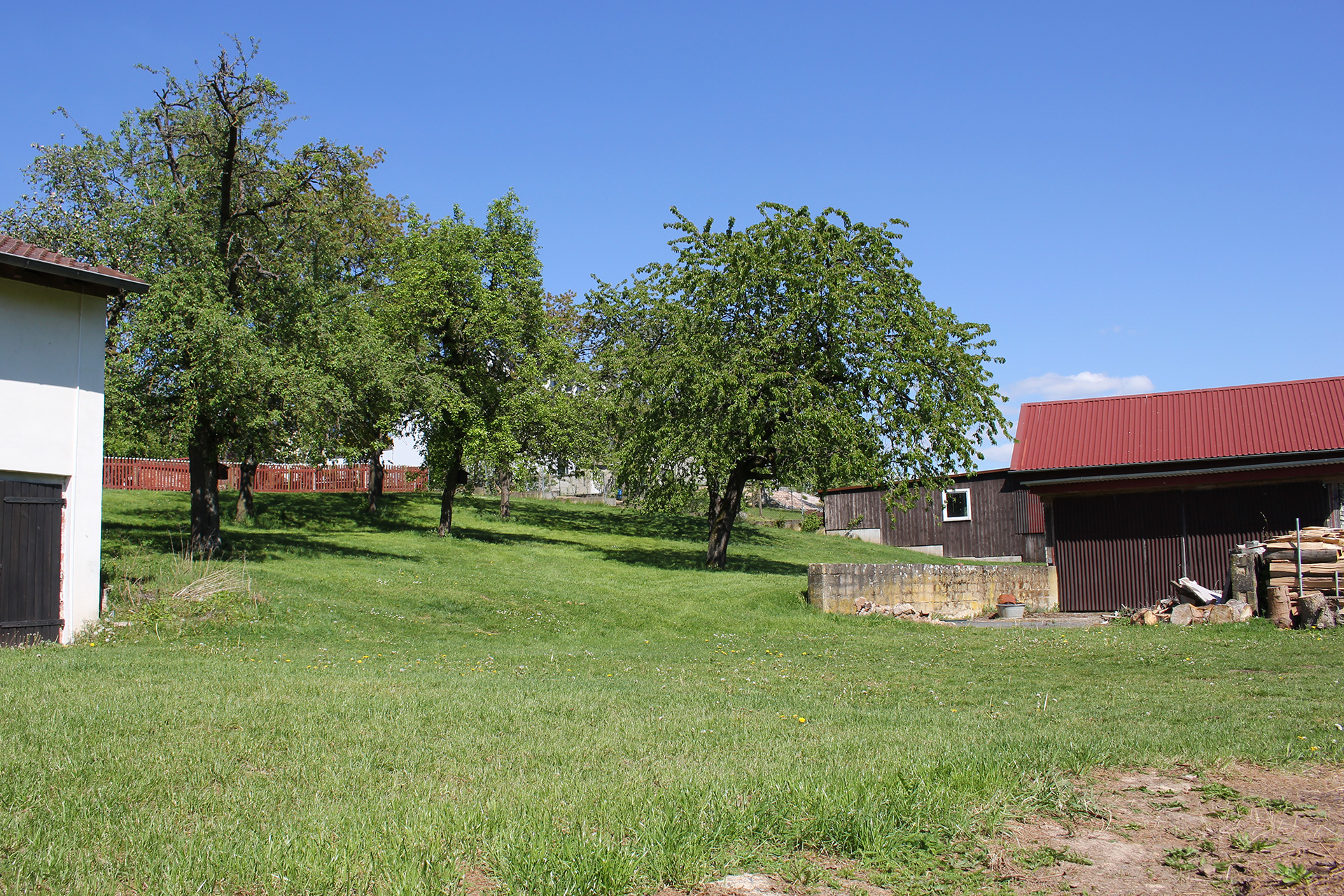 When the owners annexed the neighboring farmhouse, its farmstead was stripped from its timbered stories and integrated into the huge newly built barn. Those days, the farm was one of the biggest in this village and it still operated until the beginning of this century, most recently as a dairy farm, housing about 30 cows. Apart from the barn and the outhouse, the stables, built in the late 1950ies, is a relic of those times. Behind the buidlings there is a huge lawn with an old orchard and a little creek running through. The estate backs onto meadows and old gardens, so we live close to nature.