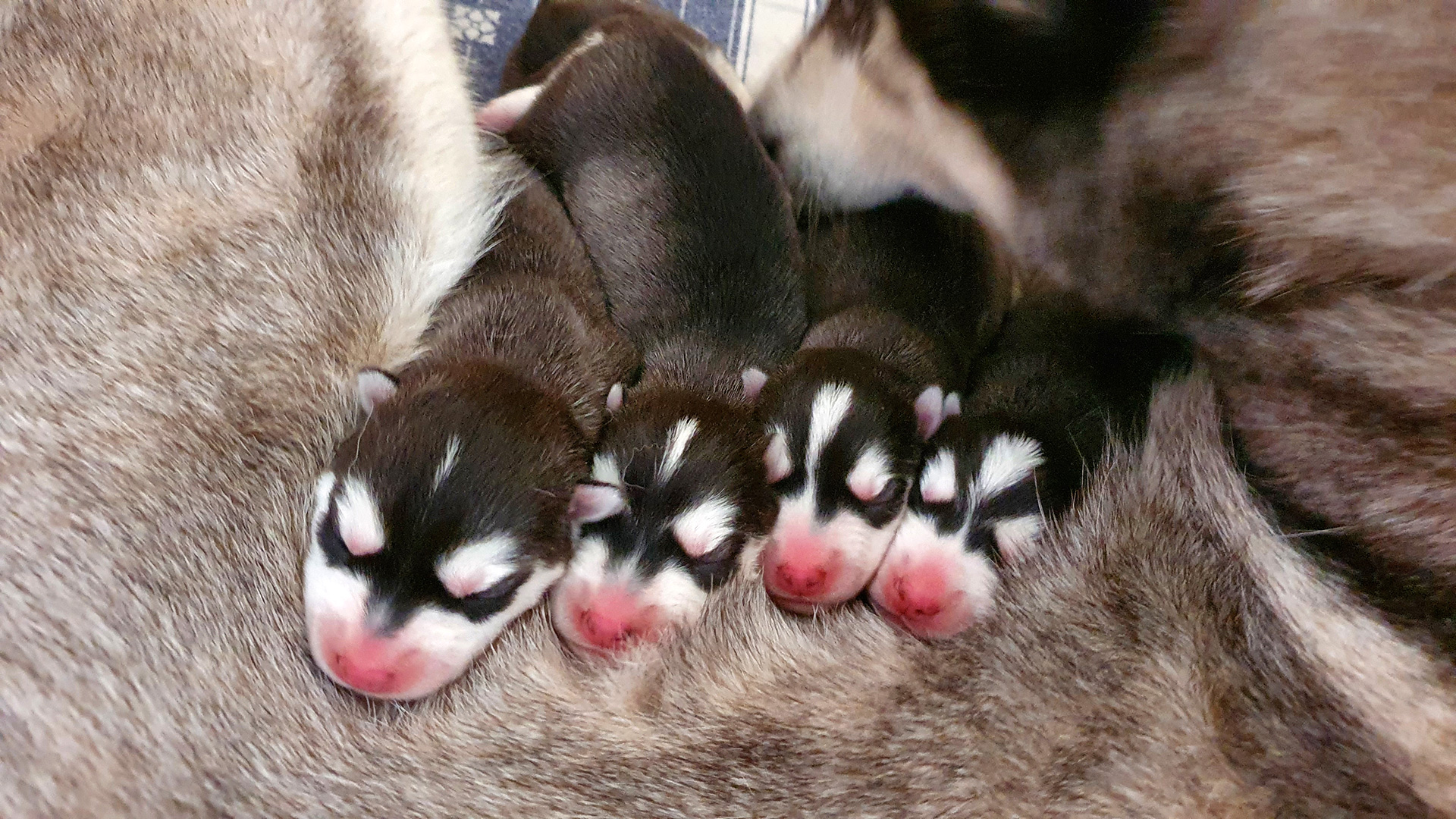 The five babies are hale and hearty, squieking, drinking and sleeping, and Ezri is a caring mother, taking care for herself too, and we are very happy. A week after the pups were born, she picked up her walkies again and loves to play with the pack.