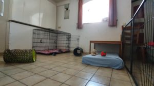 Our puppies are born in a whelping room upstairs where our bedroom is. There they spend the first three or four weeks of their life together with their mom. They are under constant surveillance, thanks to babyphone technology, and their mom can spend time outside of the whelping box, while still keeping an eye on her little ones, and make herself noticed, whenever she wants to go out like for pee and poo and walkies as well.