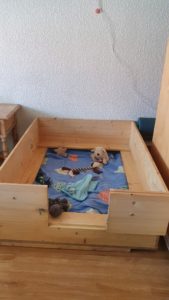 Keeping the place clean is the most important task, since the little ones are supposed to get used to keeping themselves and their nest clean. All blankets, covers and sheets are changed at least daily and washed soundly and the floor has to be mopped, whenever needed. If you think about raising a litter, rest assured that you will have to deal with tons of puppy pee and puppy poo, and that is not really cute. 😉