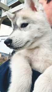Tyra is the youngest daughter of Conan and Ronja, hence she is from our first F2 litter, the Jul’babies. She and her littermates were born on December 24th, 2023. She was the last pup, born just before midnight, after Ronja had taken a long rest. She was the only “blonde” in an all black&white litter – just as our vet had predicted.